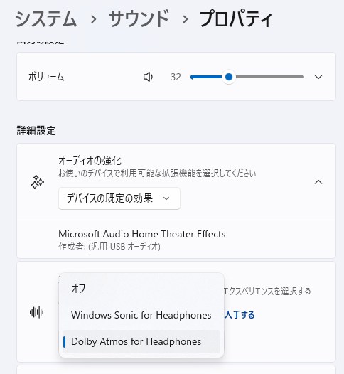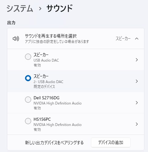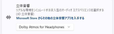 複数の音声デバイスがある場合は選択した音声デバイスのみが立体音響の設定となるので、他のデバイスは通常通りステレオ再生で使えます。
