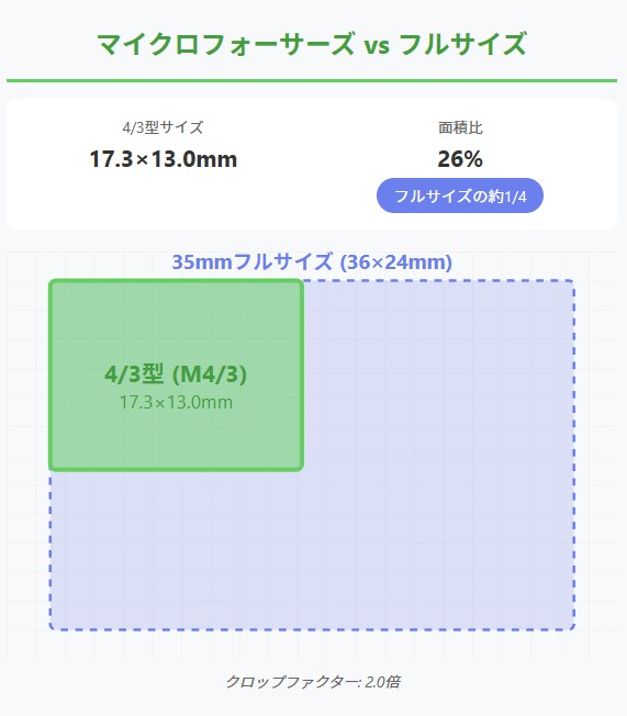 | 4/3型 | 17.3×13.0 | 8倍 | ミラーレス(軽量重視) |
