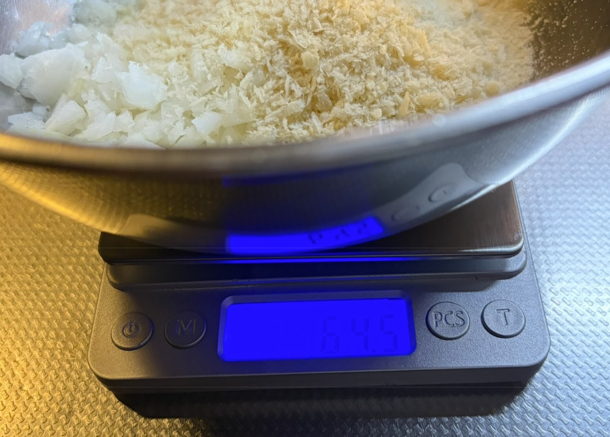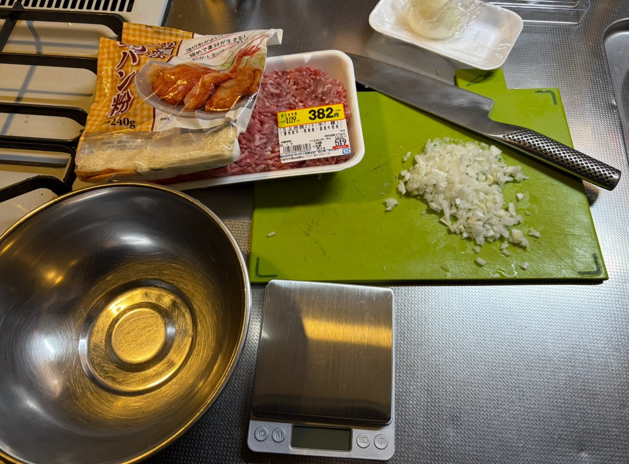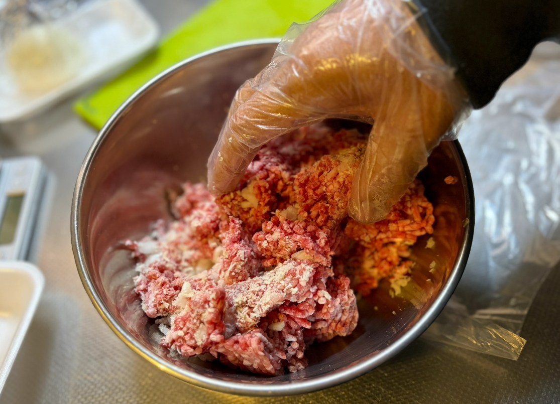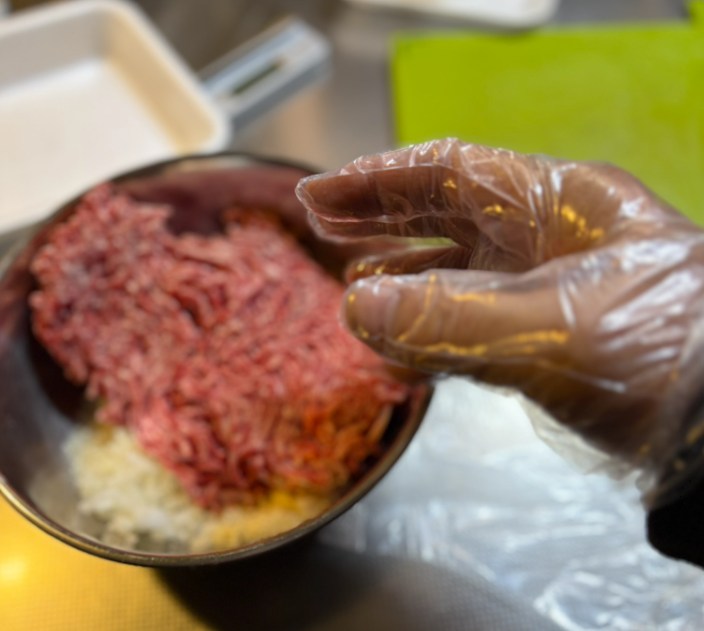 昔の厨房での修行時代のクセがぬけず最近まで素手で冷たいミンチをこねてました。