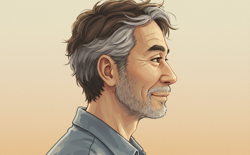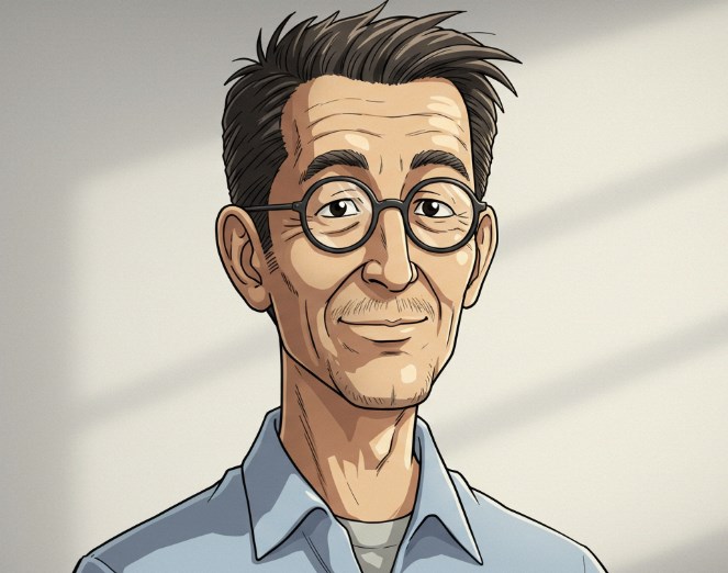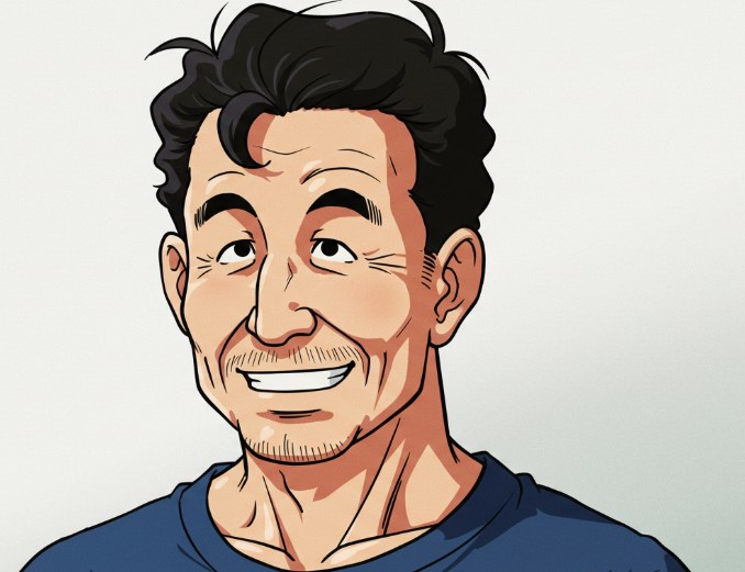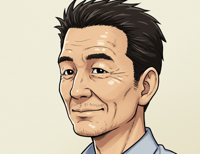 日本人男性56歳 老眼鏡をかけている 鳥山明タッチで