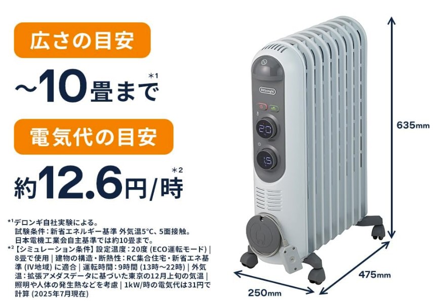 第9位:オイルヒーター(約15〜47円) 静かで乾燥しにくいが、電気代は最も高い部類に入ります。