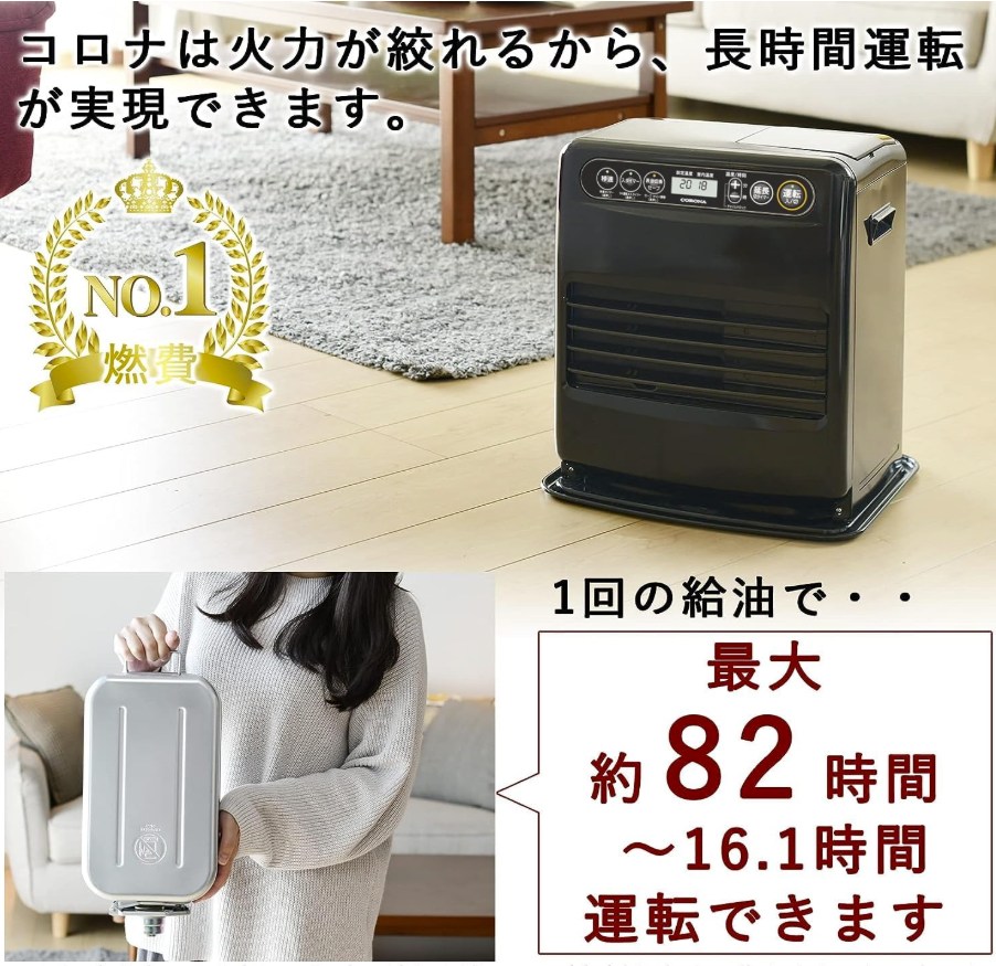 ただし、火力調節幅が狭いため、石油ファンヒーターと比べると燃費効率はやや劣ります。