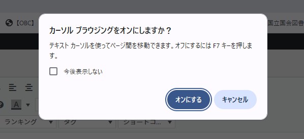 F7を押す。 - 「~をオンにしますか?」という確認ダイアログが表示されるので、「オフ(無効)」にする、あるいはダイアログを閉じて機能を無効化します。