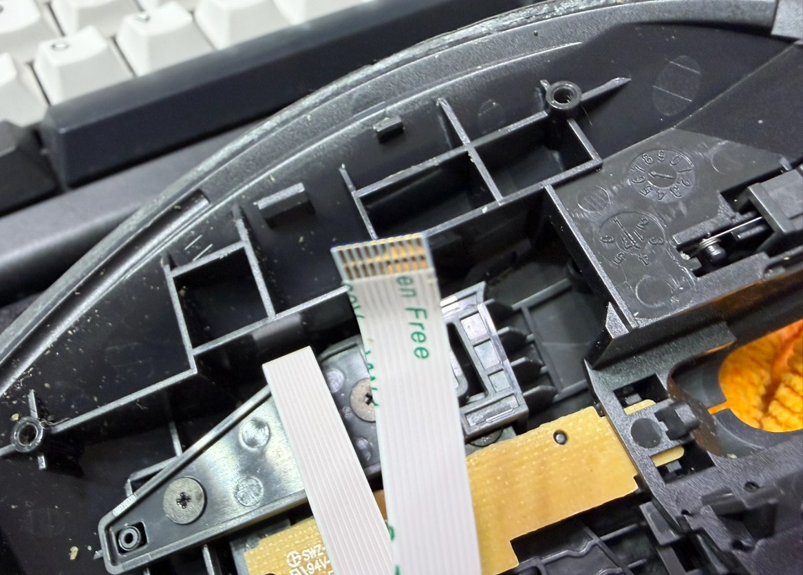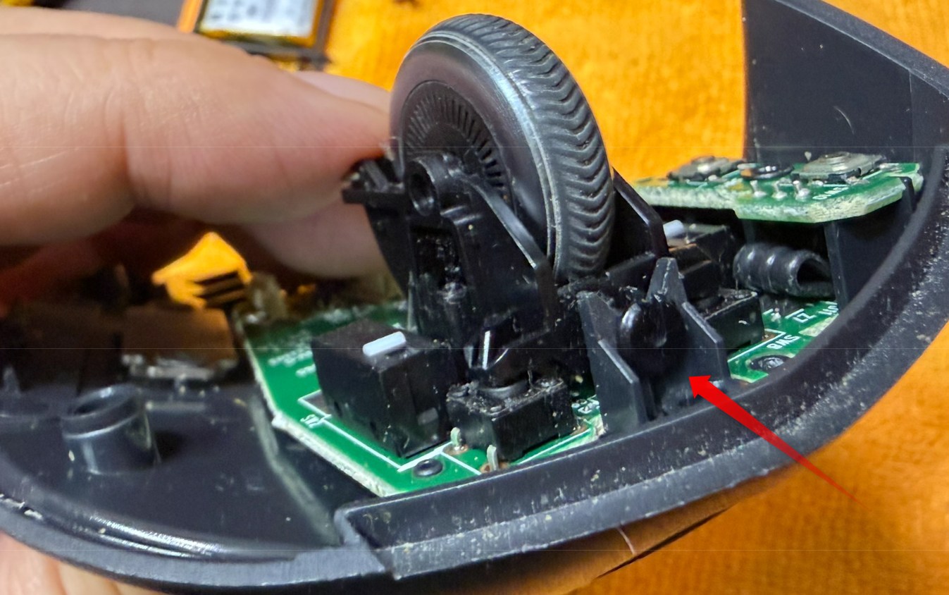 スクロールホイールのスポークをカウントする光学センサー(透明の部分)