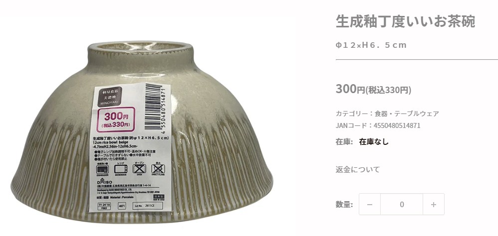 ダイソーで食器類を買うのに店舗だと持ち帰り時の破損とか怖いんで、ネットで探すのですが、いいデザインのお茶碗の在庫がないのが残念ですね、