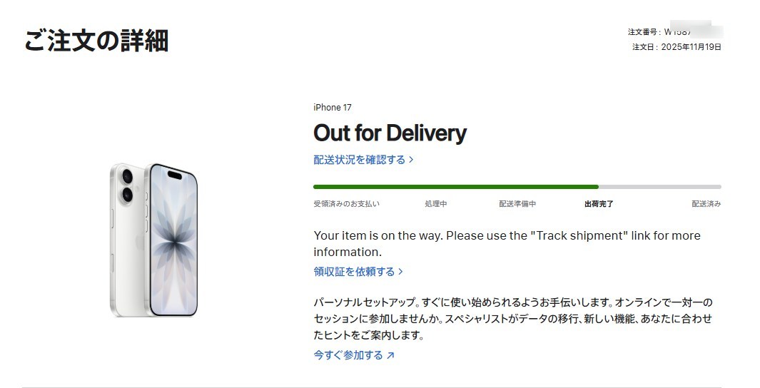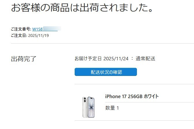 Appleストアで買い物をすると、以下のようなメッセージが届きますが、配達状況を確認するための方法がわかりません。