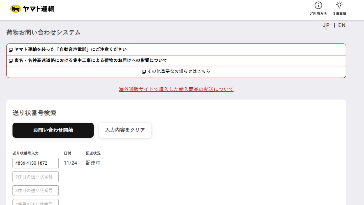 配送状況を確認する> をタップ(クリック)するとヤマト運輸の荷物お問合せシステムへ遷移します。