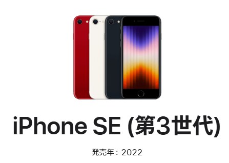 | iPhone SE(第3世代) | 2022年3月18日 | 57,800円〜77,800円 | Apple A15 Bionic | 4.7インチ 液晶 | 12MP / 7MP | 64GB / 128GB / 256GB | 5G対応、ホームボタン搭載 |
