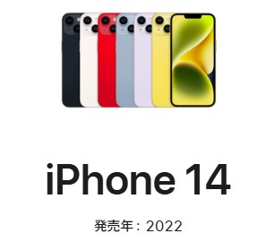 | iPhone 14 | 2022年9月16日 | 119,800円〜164,800円 | Apple A15 Bionic | 6.1インチ 有機EL | 12MP×2 / 12MP | 128GB / 256GB / 512GB | 衛星通信対応 |