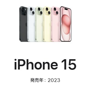 | iPhone 15 | 2023年9月22日 | 124,800円〜169,800円 | Apple A16 Bionic | 6.1インチ 有機EL | 48MP + 12MP / 12MP | 128GB / 256GB / 512GB | USB-C採用、Dynamic Island |