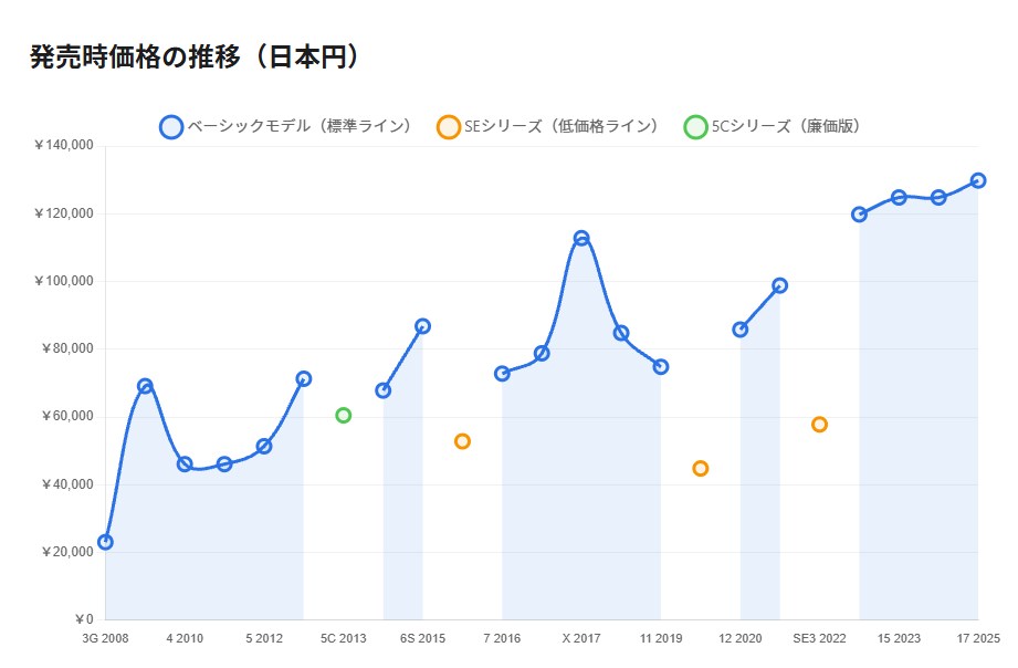 価格は年々上昇傾向にありますが、これは円安の影響だけでなく、搭載される技術の高度化、カメラ性能の向上、ディスプレイの大型化・高品質化などが要因です。一方で、SEシリーズのような低価格モデルも継続的に提供されており、幅広い価格帯で選択肢があります。