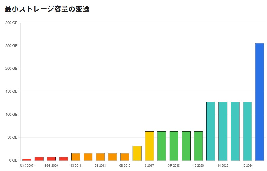 | 2017〜2019年 | 64GB | 256GB | 4K動画が普及 |
