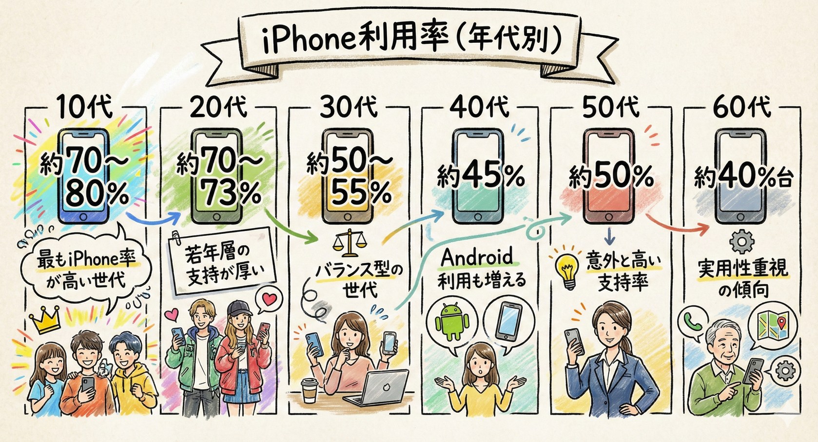 | 10代 | 約70〜80% | 最もiPhone率が高い世代 |
