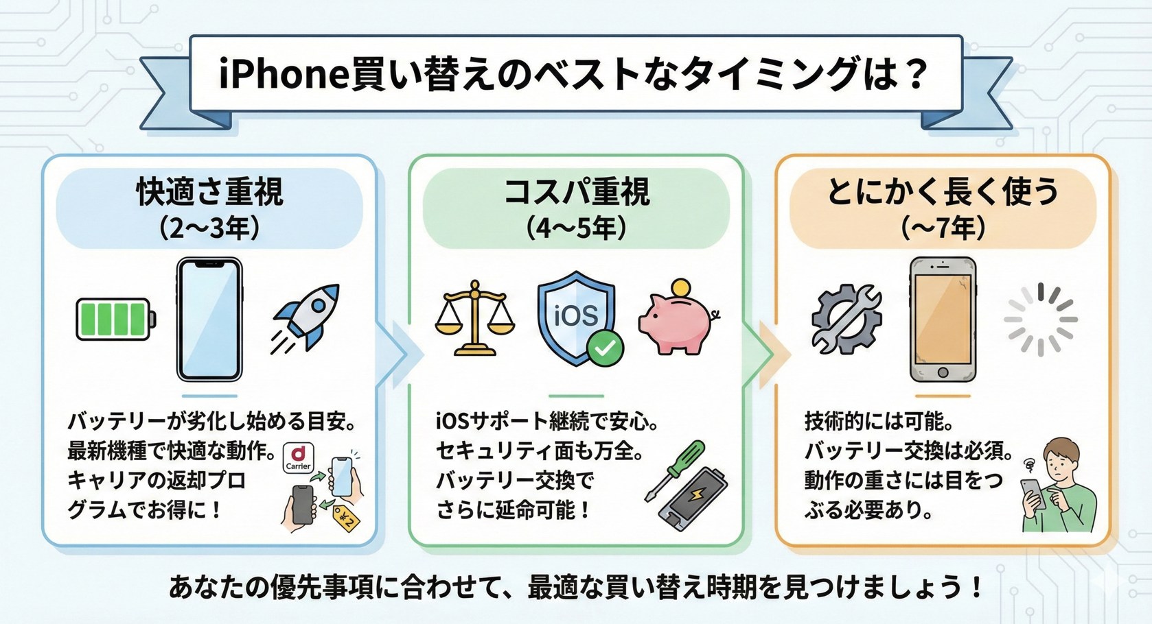 バッテリーの劣化、iOSのサポート状況、動作の快適さ。これらを総合的に判断して、自分にとってのベストなタイミングを見つけるのが一番です。